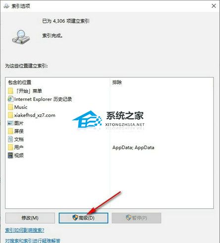 3. 进入索引选项页面之后,中点击打开“高级”选项。