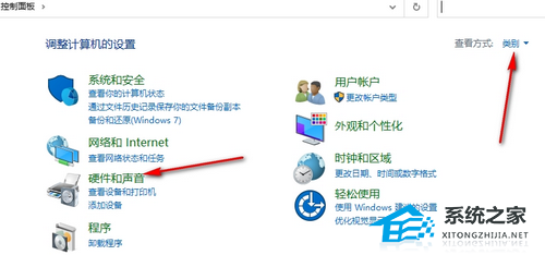 2. 在打开的页面中,将查看方式设置为【类别】,之后点击【硬件和声音】选项。