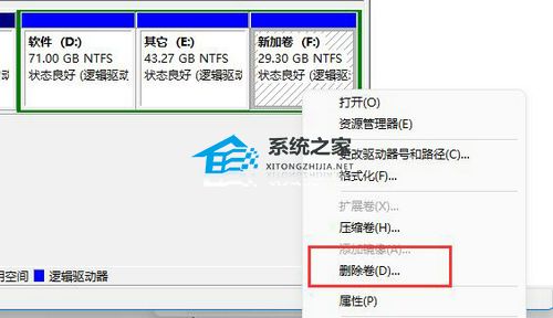 4. 右键除C盘外的卷,点击“删除卷”即可删除。