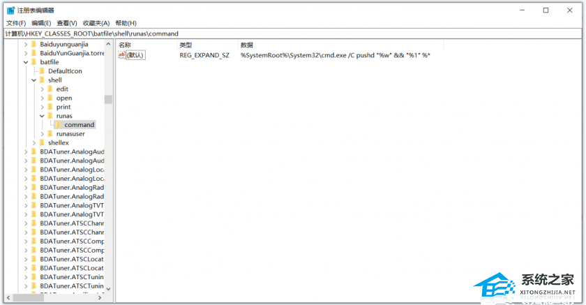 分别打开修改[HKEY_CLASSES_ROOT\batfile\shell\runas\command] 和 [HKEY_CLASSES_ROOT\cmdfile\shell\runas\command] 的默认键值,