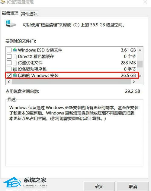 4. 在再次弹出的界面中,选择要删除的文件,列表下选择“以前的Windows安装”,点击确定。