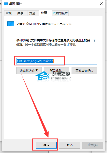2. 在属性窗口中将桌面文件保存位置更换到C盘以外的其他盘,点击确定即可。