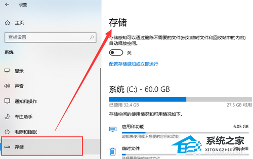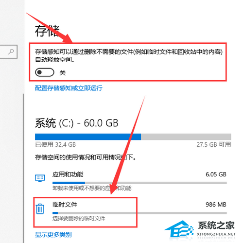 3. 可以将“存储感知”打开,系统会根据设置定期清理文件,也可以在“系统”下进行选择,删除需要清理的文件或者磁盘。