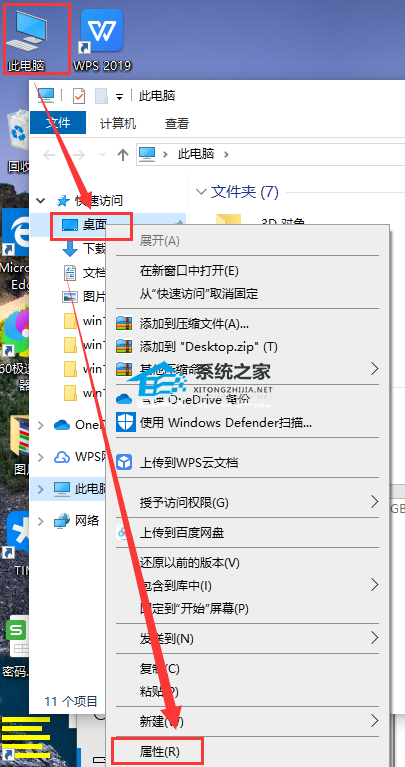 1. 找到“此电脑”并打开,在窗口左侧找到桌面,右键选择“属性”。