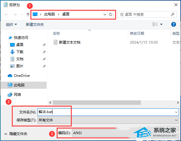 2)文件名填入以【.bat】结尾的名称,保存类型选择【所有文件】