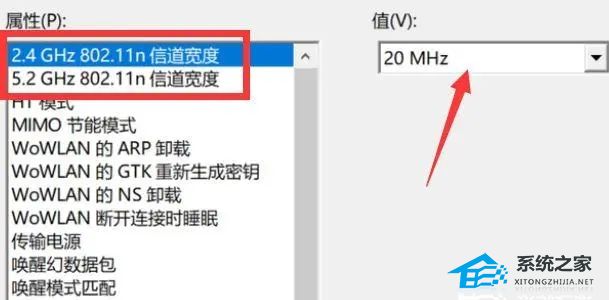 4. 随后我们在打开的界面中,将2.4GHz和5.2GHz属性直接改成20mHz且保存下来。