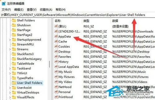 4. 再来到“HKEY_CURRENT_USER\Software\Microsoft\Windows\CurrentVersion\Explorer\User Shell Folders”位置,同样修改AppData文件夹路径。