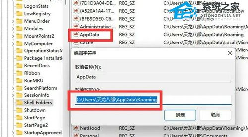 3. 双击打开其中的“AppData”,将数值数据更改为我们想要移动到的D盘位置。