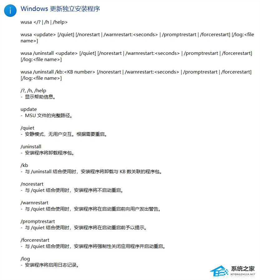 3. 这时候,会弹出【Windows 更新独立安装程序】,可以查看本次使用命令【wusa】的帮助信息;