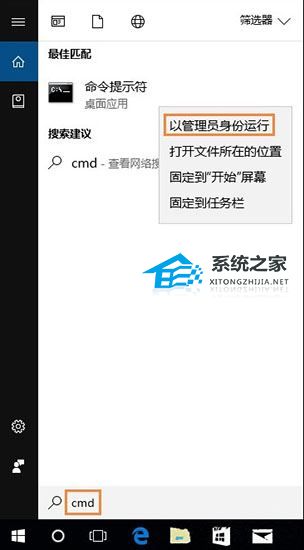 2. 搜索CMD,在搜索结果中右击CMD,然后选择“以管理员身份运行”。