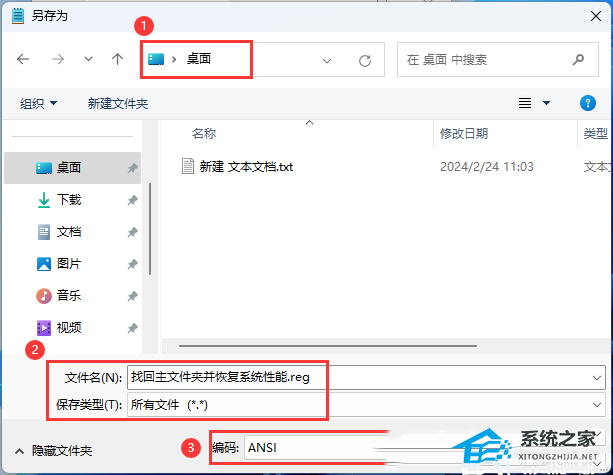 2)文件名填入以【.reg】结尾的名称,保存类型选择【所有文件】