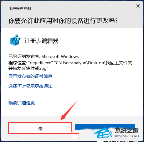 5. 双击刚才以.reg结尾的文件,在打开的用户账户控制窗口,你要允许此应用对你的设备进行更改吗?点击【是】;