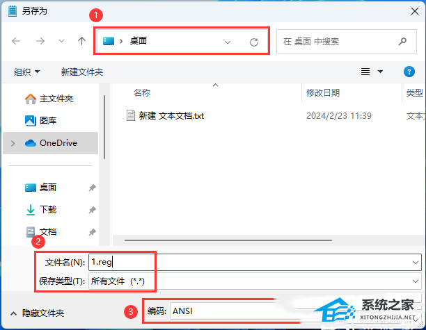 2)文件名填入以【.reg】结尾的名称,保存类型选择【所有文件】。