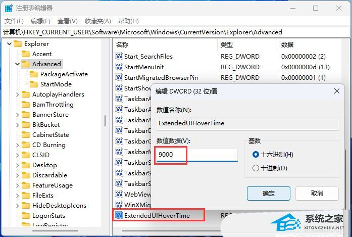 6. 新建的DWORD(32 位)值(D)命名为【ExtendedUIHoverTime】并【 双击】打开,将数值数据修改为【9000】。