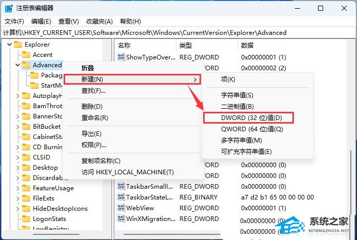 5. 【右键】点击【Advanced】,在打开的菜单项中,选择【 新建 - DWORD(32 位)值(D)】。
