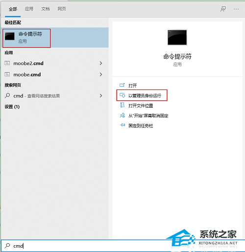在任务栏左下角搜索框输入cmd后以管理员身份运行此命令提示符。