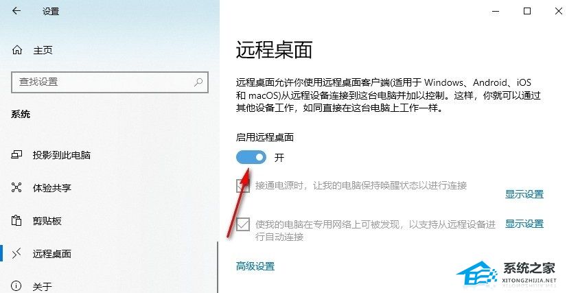 3. 接着我们在系统设置的左侧列表中找到“远程桌面”设置点击打开该设置。