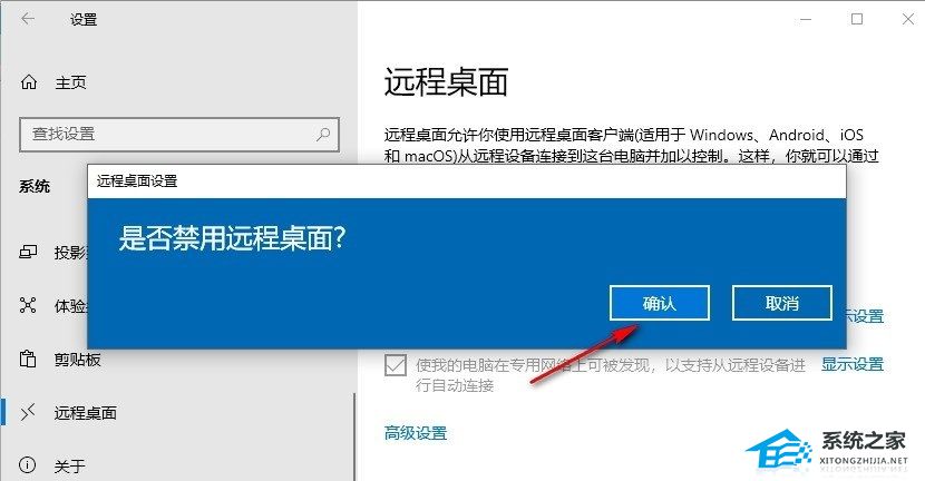 5. 关闭该开关按钮之后,页面中会出现一个是否禁用远程桌面的弹框,我们在弹框中点击“确认”选项即可。