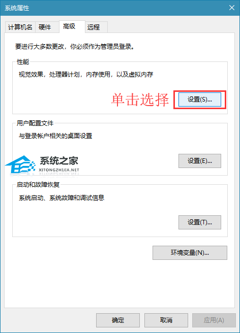 3. 在打开的窗口中,点击上方中的”高级“选项卡,再点击”性能“中的”设置“按钮。