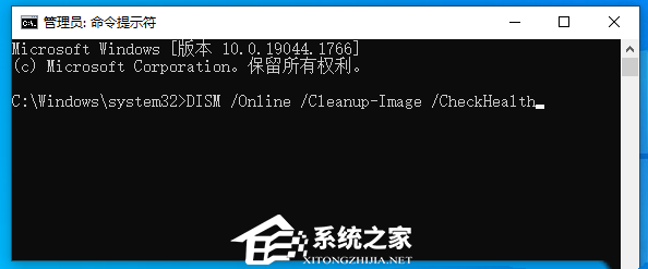 命令提示符中,输入并按回车执行【DISM /Online /Cleanup-Image /CheckHealth】命令,该命令可以用来修复Windows系统镜像、安装程序、恢复程序和PE系统。
