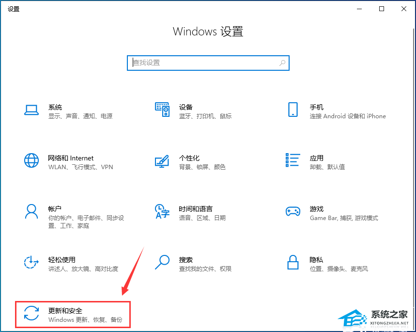 2. Windows 设置窗口,搜索框可以查找设置,也可以直接点击【更新和安全(Windows 更新、恢复、备份)】;