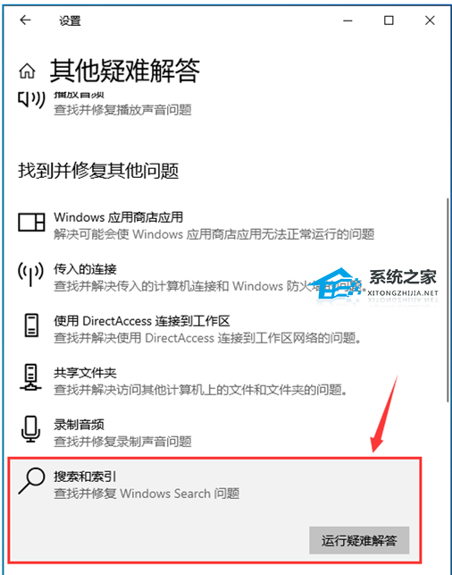 4. 找到【搜索和索引(查找并修复 Windows Search)】,点击【运行疑难解答】;