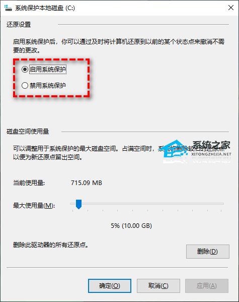 步骤2:在弹出的窗口中,选择“启用系统保护”,再点击“确定”。