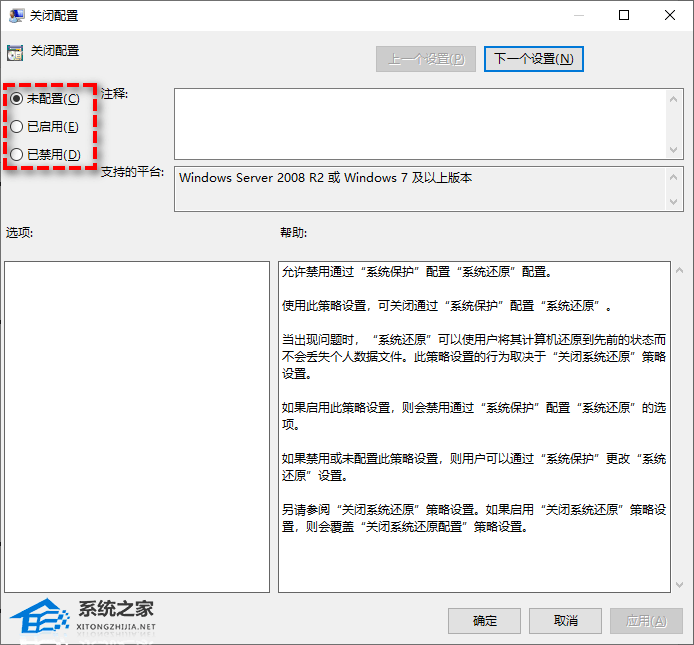 步骤4:然后你需要检查“关闭配置”和“关闭系统还原”的状态。如果其中任何一个处于“启用”状态,请双击它,将其改为“未配置”。