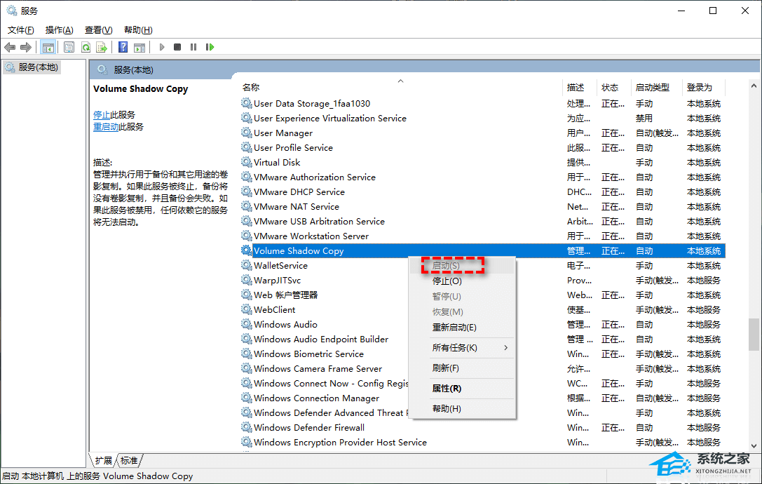 步骤2:找出名为Volume Shadow Copy的服务。如果它没有运行,请右键点击,然后选择“启动”;如果正在运行,请停止运行并重新启动。