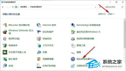 2. 进入控制面板页面之后,将查看方式改为“大图标”,打开“轻松使用设置中心”选项。