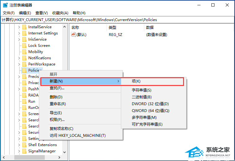 4. 选择并【右键】点击【Policies】,在打开的菜单项中,选择【新建 - 项】;