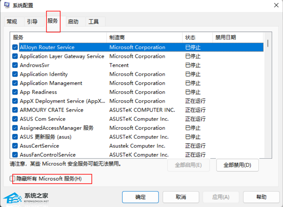 2. 在“系统配置的服务 ”选项卡 上,选择 “隐藏所有 Microsoft 服务”,然后选择 “全部禁用”。 选择“应用”。