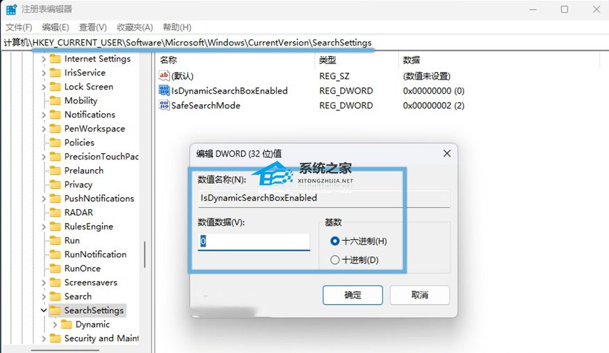 3. 打到并双击打开名为IsDynamicSearchBoxEnabled的 DWORD(32 位)值,将其值改为: