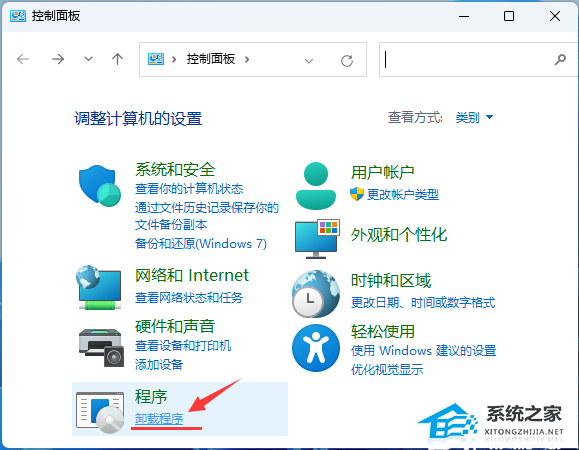3. 控制面板窗口,切换到【类别】查看方式,然后点击调整计算机的设置下的【卸载程序】。