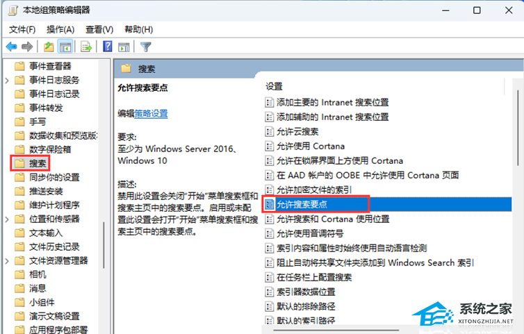 3. 本地组策略编辑器窗口,依次展开到【计算机配置 - 管理模板 - Windows 组件 - 搜索】,在右侧面板中找到并双击【允许搜索要点】策略。