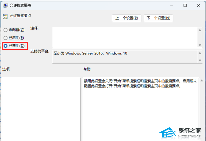 禁用此设置会关闭“开始”菜单搜索框和搜索主页中的搜索要点。启用或未配置此设置会打开“开始”菜单搜索框和搜索主页中的搜索要点。