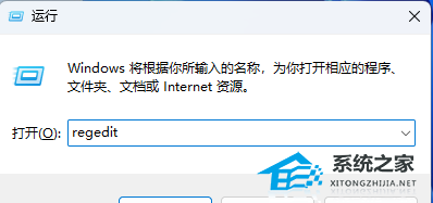 2. 运行窗口,输入【regedit】命令,再按【回车或确定】打开注册表编辑器。