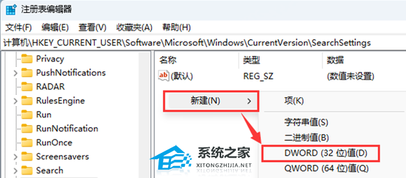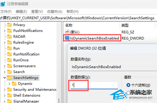 6. 新建DWORD (32 位)值(D)命名为【IsDynamicSearchBoxEnabled】并双击打开,将其值改为: