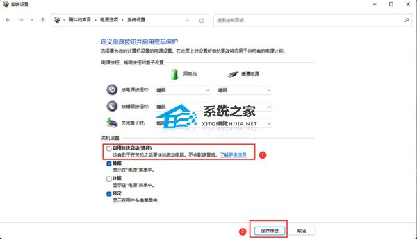 4. 点击更改当前不可用的设置,取消勾选快速启动,然后保存修改即可。