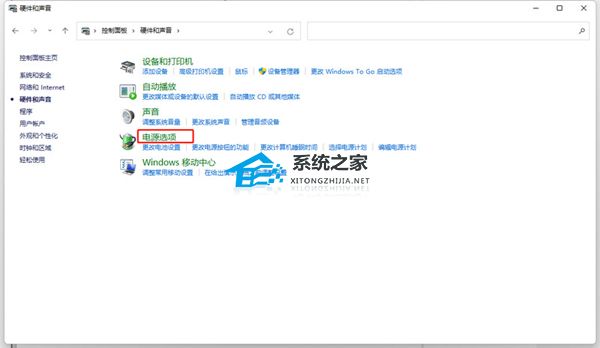 2. 打开硬件和声音,选择电源选项点开。
