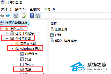 2. 依次展开系统工具>事件查看器>windows日志>系统。
