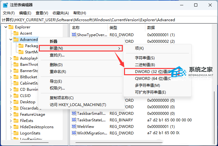 5. 【右键】点击【Advanced】,在打开的菜单项中,选择【新建 - DWORD (32 位)值(D)】。