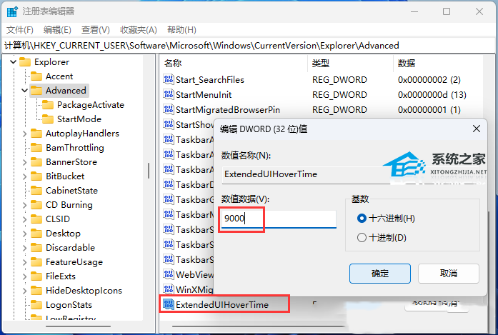 6. 新建的DWORD (32 位)值(D)命名为【ExtendedUIHoverTime】并【双击】打开,将数值数据修改为【9000】。