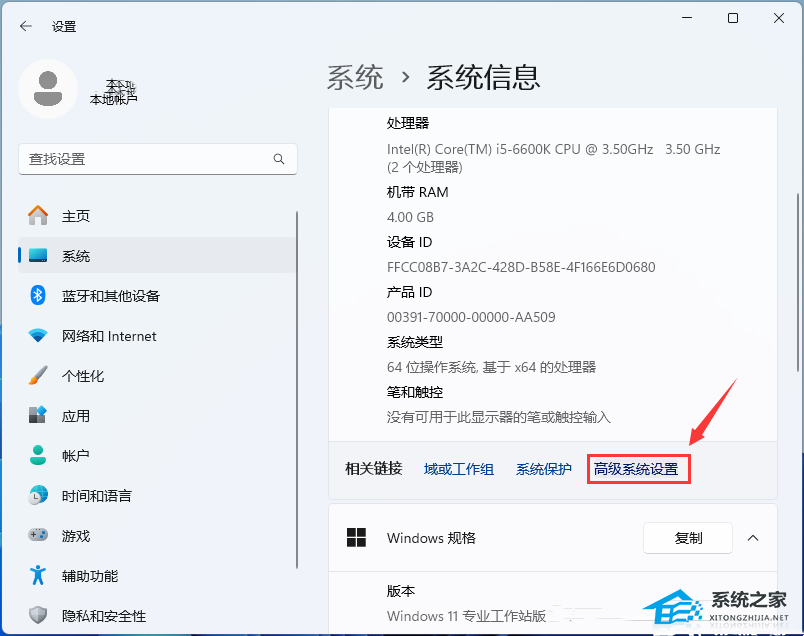 2. 当前路径为:系统 > 系统信息,相关链接下,点击【高级系统设置】。