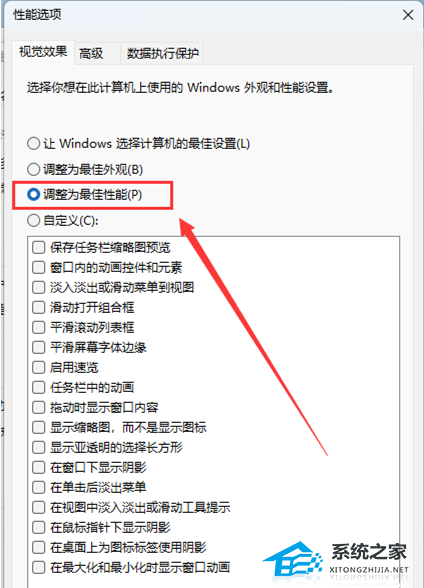 4. 性能选项窗口,点击【调整为最佳性能】,再点击【确定】。
