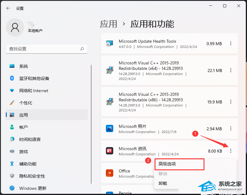 3. 当前路径为:应用 > 应用和功能,找到并点击Microsoft 资讯旁的【⋮】,然后点击【高级选项】。