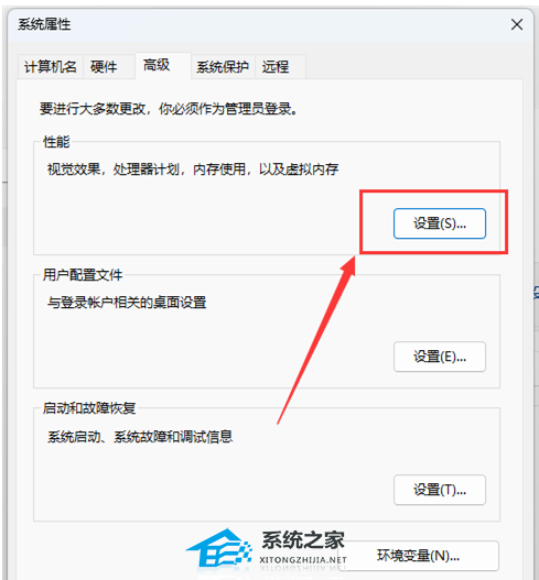 3. 系统属性窗口,切换到【高级】选项卡后,再点击性能(视觉效果,处理器计划,内存使用,以及虚拟内存)下的【设置】。