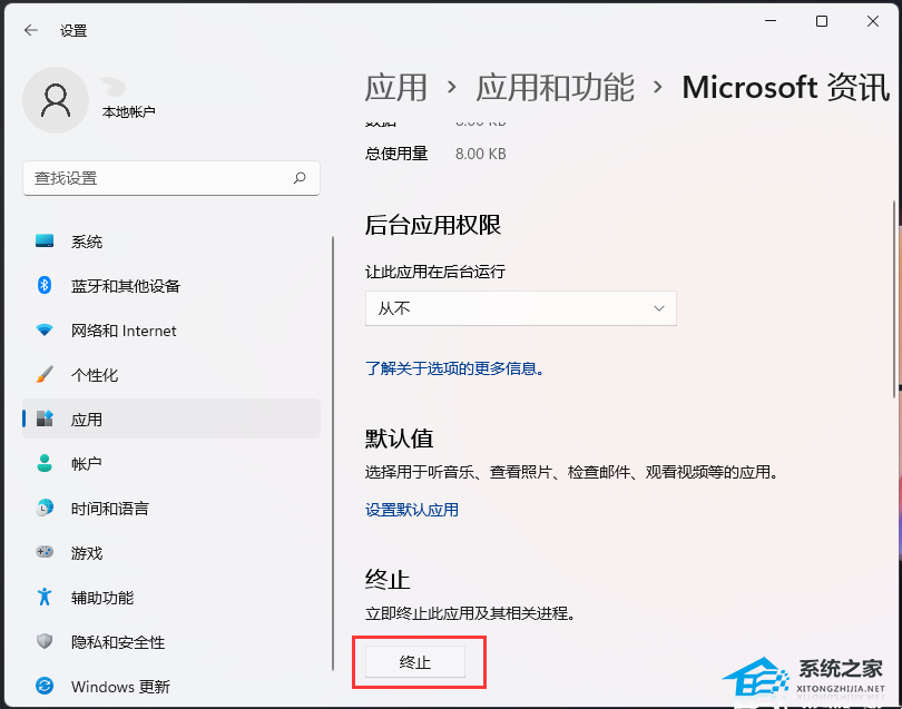 4. 往下,找到并点击【终止(立即终止此应用及其相关进程)】。