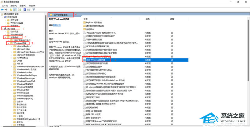 2. 进入:用户配置–>管理模板–>Windows组件–>文件资源管理器–>“关闭Windows键热键”,右键修改状态为“未配置”或“未启用”。