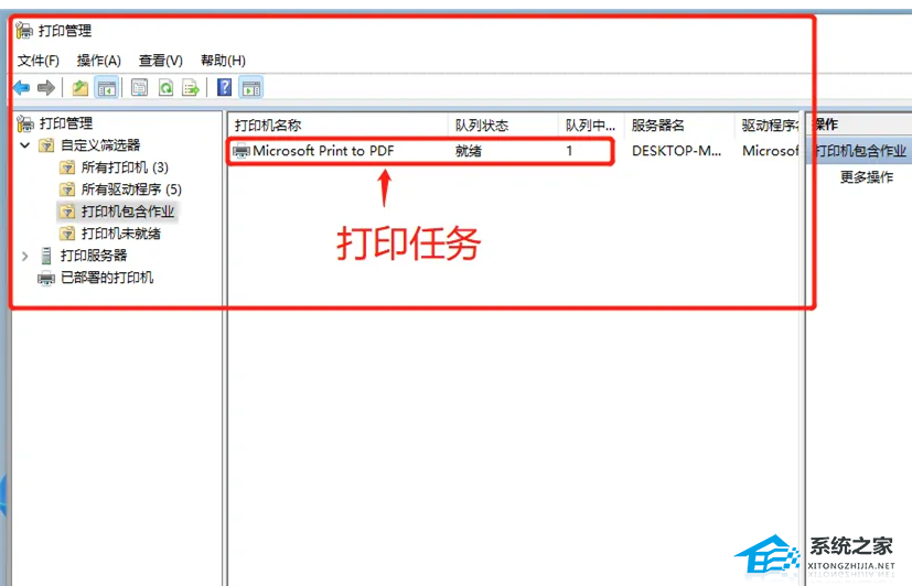2. 打印管理窗口,左侧点击展开【自定义筛选器】,再点击【打印机包含作业】。